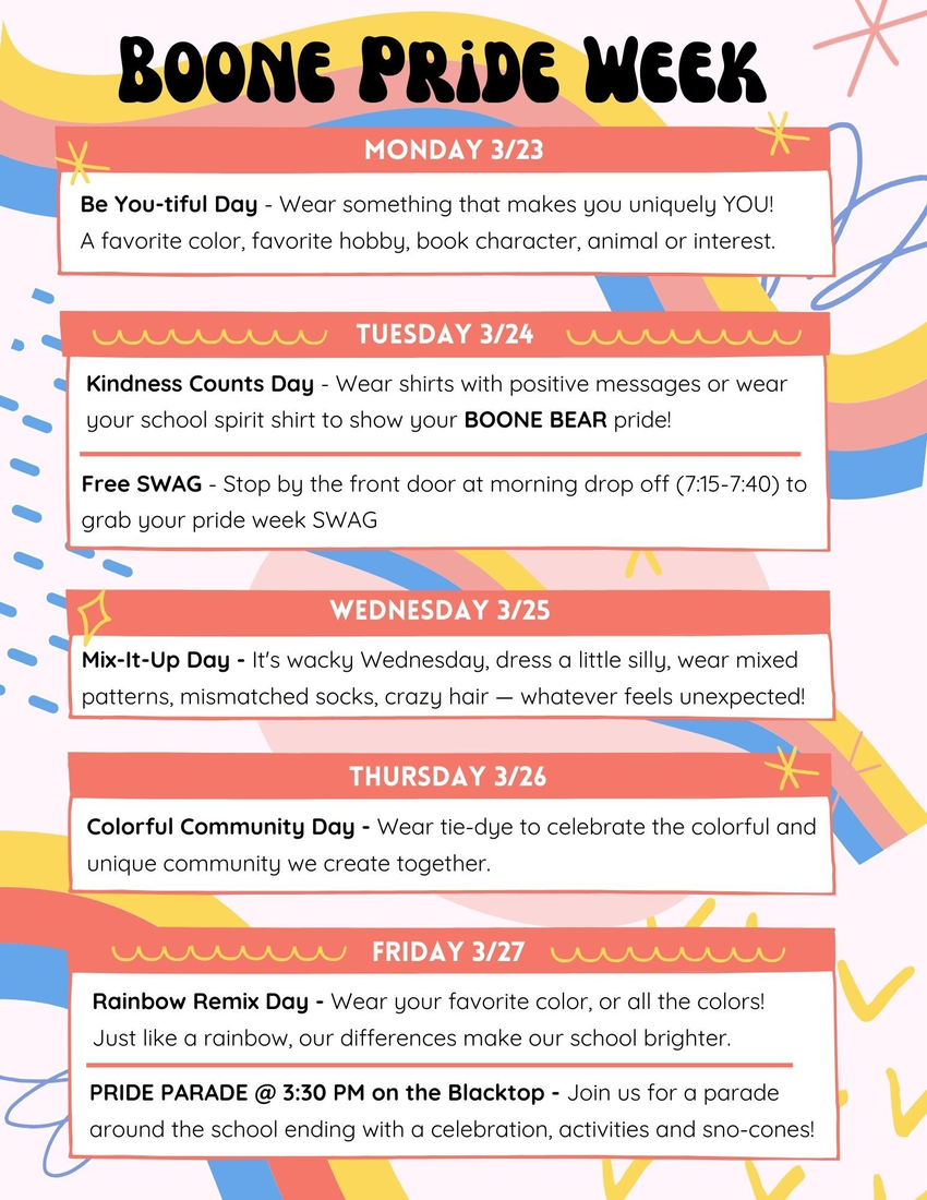 Back to Calendar Date Friday, March 27, 2026 - All day Join us after school for a Pride March around Boone to be followed by a picnic and snow cones! Add to my Calendar iCal, iCloud, Outlook+ Google Calendar Download .ics file Print